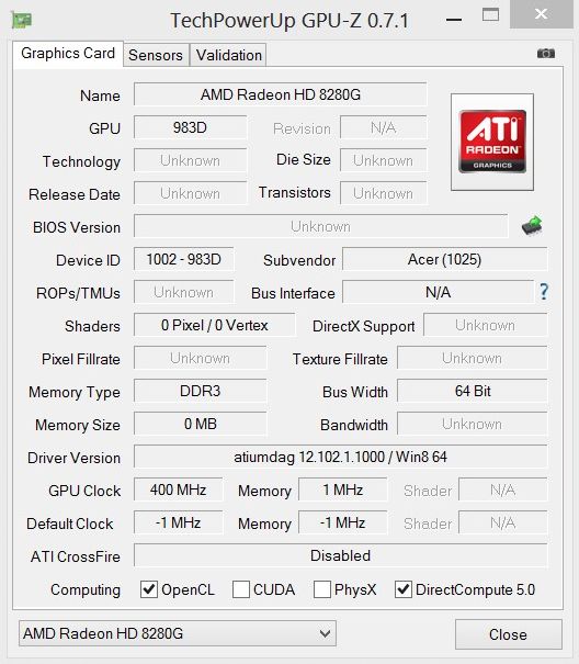 Nampaknya GPU-Z masih belum bisa mendeteksi GPU terintegrasi dari Temash A6-1450 dengan benar – disini terdeteksi sebagai Radeon HD 8280