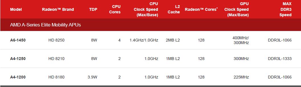 Dari seluruh lini produk AMD Elite Mobility APU ‘Temash’, AMD A6-1450 merupakan produk dengan spesifikasi tertinggi. Prosesor A6-1450 dilengkapi dengan clock default sebesar 1 Ghz dan bisa meningkat ke 1.4Ghz saat fitur ‘Turbo Dock’ aktif.