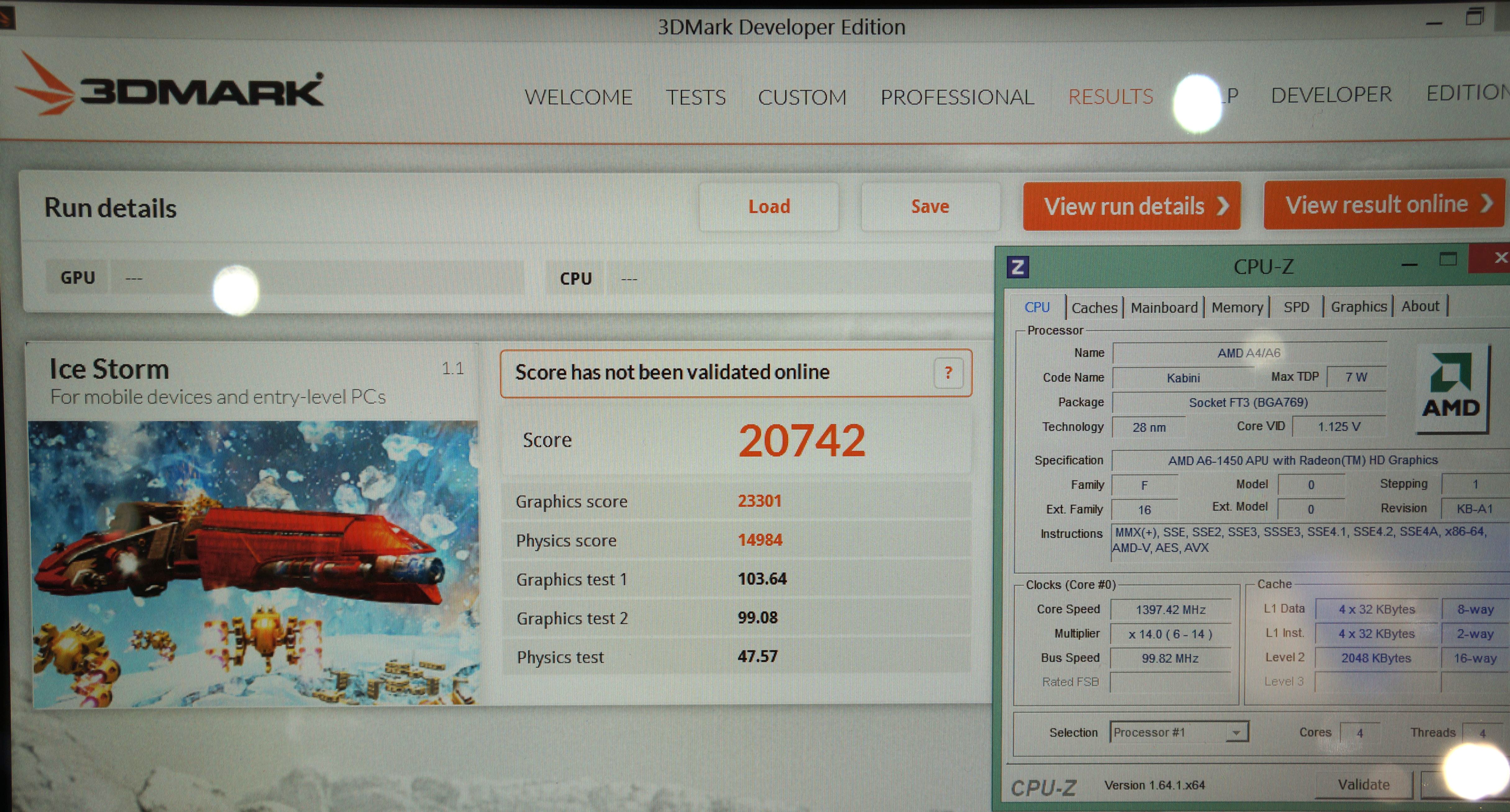 Mengingat GPU Radeon HD 8250 yang ada di A6-1450 memiliki clock 400Mhz, atau hampir dua kali lipat yang kami temui pada A4-1200, kami menjumpai skor yang mengagumkan : lebih dari 20.000 poin dalam 3DMark Ice Storm. Skor ini mungkin masih jauh lebih rendah dari beberapa GPU diskrit yang dijumpai pada notebook, namun perlu diingat bahwa skor ini dihasilkan oleh sebuah SoC (System-on-Chip) rendah daya yang memiliki TDP hanya 8 Watt!