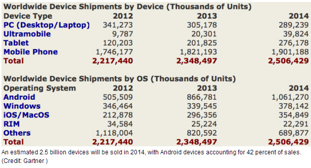 Perusahaan periset pasar IT, Gartner, memproyeksikan pada 2014 nanti, sebanyak 2,5 miliar perangkat global akan dijual di seluruh dunia atau meningkat enam persen dibanding tahun sebelumnya (2013). Dari angka tersebut, sebanyak 75 persen akan dikuasai oleh perangkat Android, sisanya dimiliki oleh iOS Apple, lalu diikuti oleh Windows Phone.