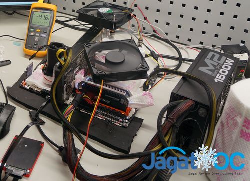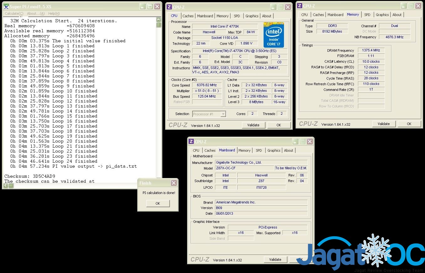 Dengan setting diatas, kami berhasil melakukan boot ke OS, lalu meningkatkan 1(satu) mutiplier lagi melalui tombol OC Touch ke 51x untuk mendapatkan clock CPU Termaksimal kami yakni 6.37Ghz dengan hanya 2(dua) Core dan 2(dua) Thread aktif untuk menjaga kestabilan. Dengan clock ini kami mendapat hasil benchmark SuperPI 32M sebesar 4 menit dan 57.234 detik.