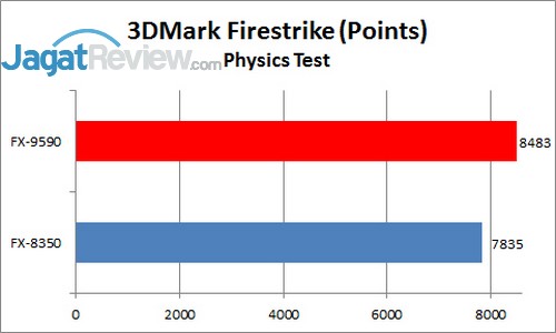 Physics test pada pengujian terkini dari Futuremark ini adalah indikator yang baik untuk performa prosesor. Hasilnya, FX-9590 menang cukup telak dibandingkan FX-8350.