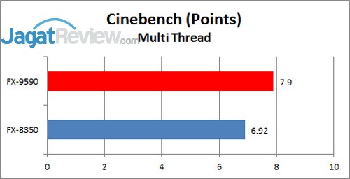 Dalam kondisi multi-thread, lagi-lagi kita bisa melihat perbedaan performa, meski tidak terlalu signifikan, mengingat FX-8350 pun menggunakan jumlah core yang sama dengan FX-9590.