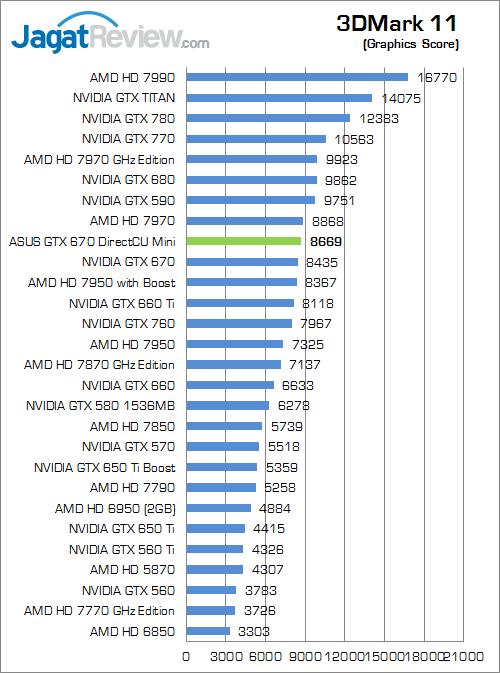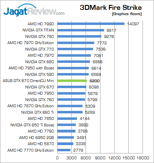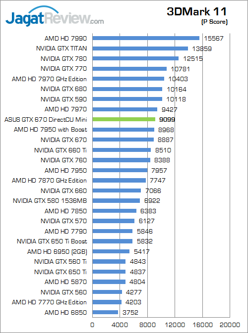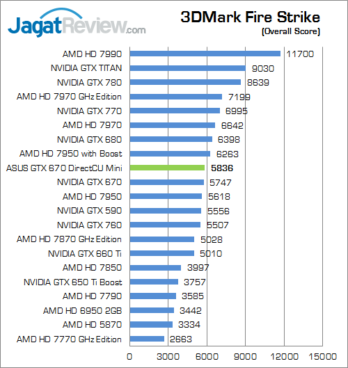 Benchmark sintesis generasi terbaru berbasiskan DirectX 11 dari Futuremark ini memperlihatkan ASUS GTX 670 DirectCU Mini memiliki keunggulan 1% saja di atas versi reference.