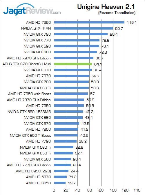 Tidak ubahnya dengan benchmark sebelumnya, ekstra 13 MHz yang dimiliki ASUS GTX 670 DirectCU Mini hanya memberikan suntikan tenaga sekitar 1% saja baik pada UH 2.1 maupun UH 4.0.