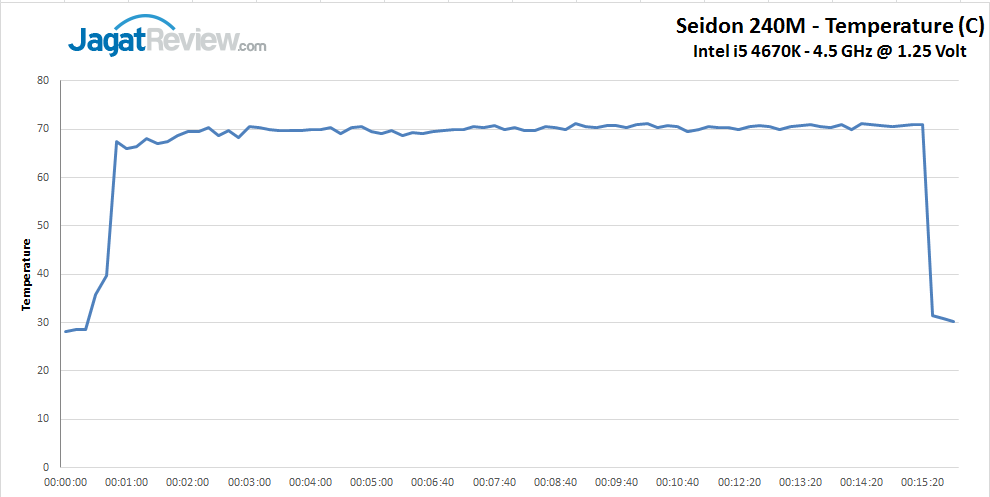 Prosesor Haswell sudah terkenal dnegan suhu yang tinggi, terlihat pada artikel “Intel ‘Haswell’ K-Series Overclocking Guide” bahwa suhu operasi prosesor tersebut bisa dikatakan cukup memberikan tantangan tersendiri untuk sistem pendingin. Sebagai sebuah water cooling yang didesain untuk overclocking, Cooler Master Seidon 240M dapat menahan suhu pada saat Haswell diberikan maximum load dalam keadaan teroverclock. Dengan skenario overclocking, Seidon 240M dapat menahan suhu Haswell pada kisaran 70°C. Pada awalnya kami mencoba untuk menguji dengan menggunakan stock heatsink akan tetapi kami tidak berani melanjutkan test kami pada menit ke 6, karena Core Temp menunjukkan bahwa suhu processor kami ada pada 100°C dengan catatan Haswell kami berjalan default.
