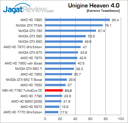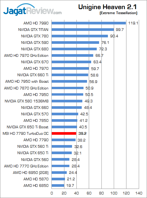 Pada Unigine Heaven 2.1, performa MSI HD 7790 TurboDuo OC unggul sekitar 2.6% di atas HD 7790 reference, sedangkan pada versi 4 keunggulan tersebut berkisar 1.8%.