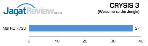 Teman Crysis 3 sebagai game terberat di tahun 2013 ini memang sangat “kejam” saat menyiksa kemampuan graphics card seperti terlihat pada grafik di atas. Walapun begitu, MSI HD 7730 tetap mampu menjalankan game ini dengan melakukan penurunan setting kualitas grafik.