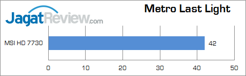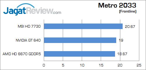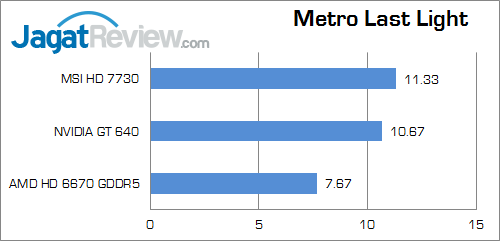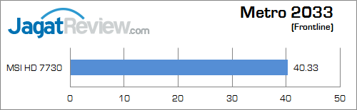 Performa MSI HD 7730 terpaut tipis tidak sampai 2 fps dengan GeForce GT 640 dan 2 fps jika dibandingkan dengan HD 6670 GDDR5.