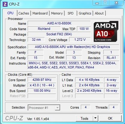 Perlu diketahui, AMD menyiapkan A10-6800K untuk beroperasi hingga clock 4.4Ghz berkat teknologi AMD Turbocore, dan clockspeed seperti ini terbilang cukup kencang untuk CPU kelas mainstream kebawah. Selama pengujian berlangsung, CPU A10-6800K kami berjalan di clock 4.2 – 4.3Ghz pada saat menangani aplikasi multi-threaded, dan sesekali mencapai 4.4Ghz pada aplikasi ringan yang memakai single thread.