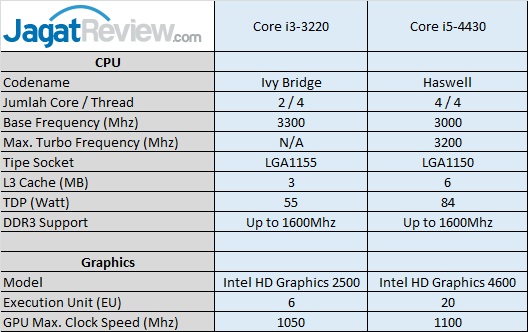 Prosesor Core i3-3220 akan dipasangkan dengan motherboard Z77, sedangkan prosesor Core i5-4430 akan dipasangkan dengan motherboard Z87. Disini, kami akan menguji grafis terintegrasi dari kedua prosesor ini, sekaligus performa mereka berdua pada uji performa dengan VGA add-on. Oh ya, meskipun tidak ‘resmi’ mendukung DDR3-2133(website Intel menyatakan dukungan resmi hanya sampai DDR3-1600), kami tetap menguji Intel Core i5-4430 dengan DDR3-2133 hanya untuk melihat scaling performa grafis Intel HD di clock memori yang tinggi.