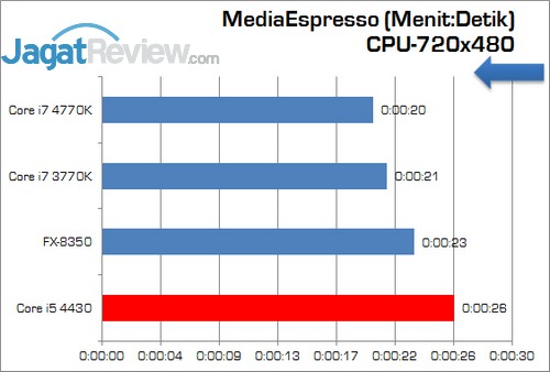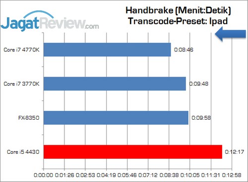 Bukan kejutan kalau sekali lagi Core i5 4430 tertinggal dari 4470K dan 3770K. Yang mengejutkan adalah prosesor ini mampu “menaklukkan” AMD FX-8350 dalam benchmark ini. Walau hanya menang dengan perbedaan 6%, tetapi mengingat bahwa perbedaan clock dan thread yang cukup jauh, membuatnya tetap mengejutkan.