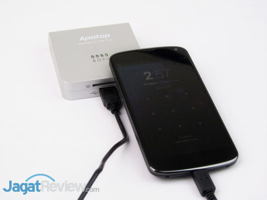 Fungsi lain yang dimiliki oleh perangkat Wi-Reader Pro ini adalah sebagai sebuah power bank. Baterai internal yang dimiliki Wi-Reader Pro bisa dimanfaatkan untuk mengisi daya perangkat lain dengan memanfaatkan port USB yang ada. Kami mencoba menggali lebih dalam lagi kemampuan perangkat dari Apotop ini sebagai sebuah power bank.