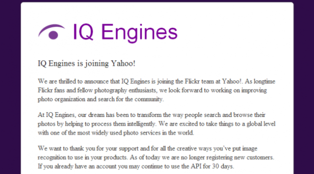 Yahoo kembali mengakuisisi perusahaan rintisan atau startup. Kali ini IQ Engines, startup pengembang aplikasi pengenal gambar foto yang dicaplok Yahoo. Teknologi IQ Engines nantinya akan diintegrasikan ke jejaring sosial berbagi foto milik Yahoo, Flickr. Yahoo berharap, IQ Engines dapat memperbaiki pengaturan dan pencarian foto di Flickr. Sayangnya, dalam waktu 30 hari ke depan, Yahoo memutuskan akan menutup semua layanan IQ Engines.