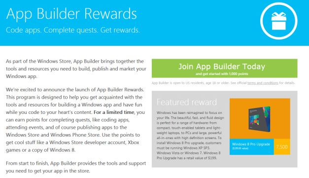 Raksasa sistem operasi, Microsoft meluncurkan program baru bernama “App Builder Reward”. Program tersebut dikhususkan bagi programmer amatir yang mampu menciptakan aplikasi untuk Windows 8. Melalui sistem poin, pengembang diiming-imingi berbagai hadiah menarik buatan Microsoft, termasuk Game Xbox.