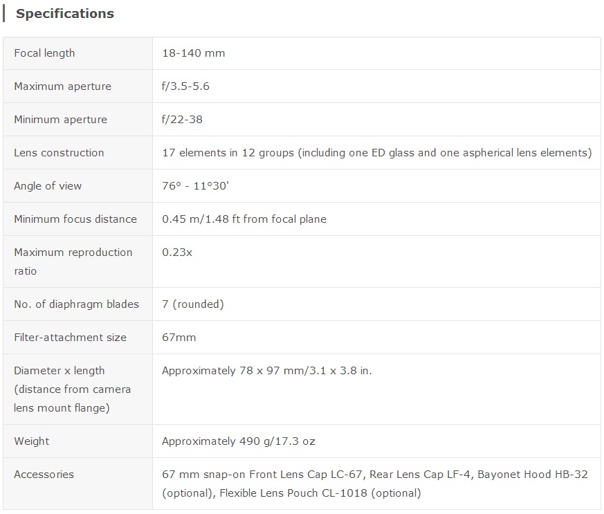 Berikut spesifikasi singkat dari Lensa Nikkor AF-S 18 – 140 mm F/3,5~5,6 ini: