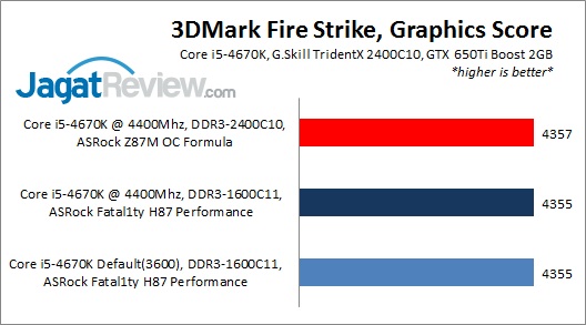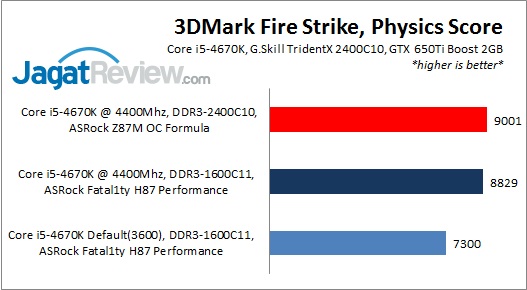 Pada 3DMark Fire Strike, skor Z87 dan H87 yang dioverclock ternyata tidak jauh berbeda. , kecuali di Physics Score, dimana platform Z87 unggul lagi-lagi karena kecepatan RAM yang lebih tinggi.