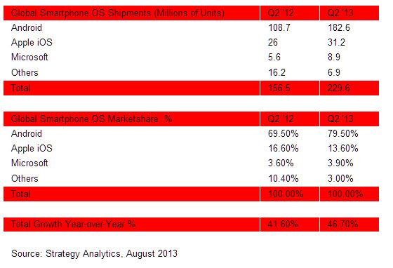 “Pengiriman smartphone global tumbuh 47 persen per tahun dari 156.500.000 unit di Q2 2012 menjadi 229.600.000 di Q2 2013. Pertumbuhan ini didorong oleh permintaan yang kuat untuk perangkat Android di semua tingkatan harga di negara maju dan pasar berkembang, seperti Amerika Serikat, Cina dan Brasil,” imbuh Bicheno.