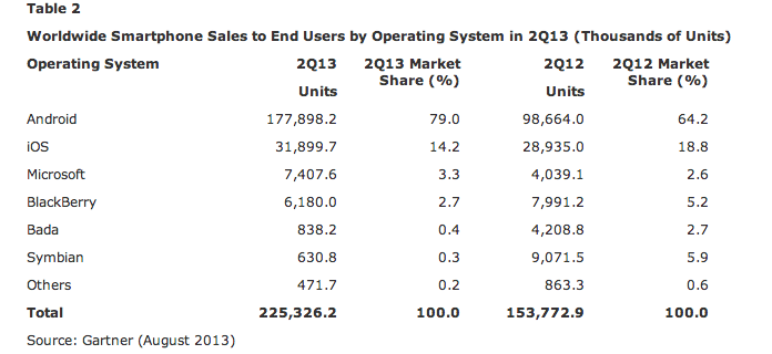 Riset tersebut dibuat berdasarkan penjualan di kuartal kedua, di mana para peneliti di Gartner mengestimasikan bahwa secara keseluruhan smartphone mampu terjual sebanyak 51.8%. Sedangkan penjualan feature phone turun sebesar 21% menjadi 210 juta unit di seluruh dunia. Studi tersebut tidak menjelaskan secara rinci penetrasi regional dari penjualan ponsel tersebut. Namun berdasarkan laporan terbaru dari comScore, penetrasi smartphone di Amerika Serikat sendiri mencapai 59%. Dari riset tersebut, Gartner juga kembali mendapatkan hasil bahwa Samsung masih menjadi pemimpin penjualan di pasar smartphone dan belum terkalahkan oleh Apple meskipun penjualan Apple ditengarai terus tumbuh sejak kuartal 2 tahun 2012 lalu. Samsung mengalami peningkatan market share dari 29.7% menjadi 31.7% sedangkan Apple di posisi kedua dengan 14.2%.