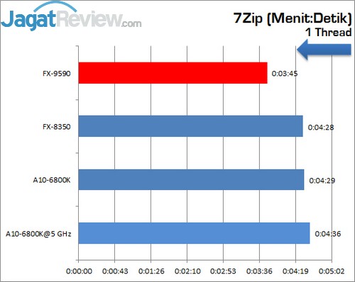 Benchmark ini adalah indikator kinerja multi thread yang cukup baik. Hasilnya pun kembali menempatkan FX-9590 diatas FX-8350. Dia berhasil meninggalkan A10-6800K 5 GHz dengan jarak yang luar biasa jauh, yaitu 64%.