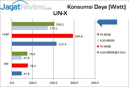 Wajar jika konsumsi daya prosesor ini terlihat “mengungguli” pembanding lainnya. Centurion yang mewarisi arsitektur Vishera memang terkenal sebagai salah satu arsitektur yang kurang efisien dalam hal konsumsi daya. Ditambah dengan clock yang cukup tinggi membuatnya memakan daya lebih besar.