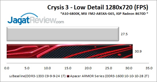 Untuk benchmark game kami menggunakan Crysis 3, dengan setting yang disesuaikan dengan penggunaan grafis terintegrasi, yakni resolusi 1280×720, detail Low, texture detail Medium. Sama halnya dengan 3DMark Fire Strike, performa grafis terintegrasi pada AMD APU disini sangat dipengaruhi oleh bandwidth memori yang digunakan.