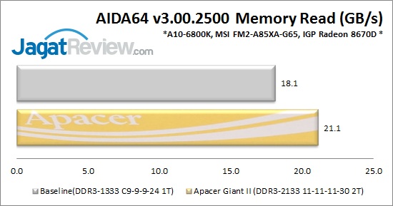 Berikut ini hasil pengujian performa dari Apacer Giant II Series DDR3-2133 8GB Kit, kami juga menyertakan performa dari RAM dengan kecepatan DDR3-1333, timing 9-9-9-24 1T(CAS-TRCD-TRP-TRAS-CMD Rate) sebagai baseline, karena inilah konfigurasi yang masih digunakan sebagian besar user.