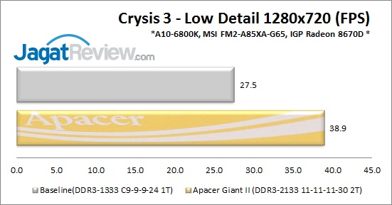 Untuk benchmark game kami menggunakan Crysis 3, dengan setting yang disesuaikan dengan penggunaan grafis terintegrasi, yakni resolusi 1280×720, detail Low, texture detail Medium. Sama halnya dengan 3DMark Fire Strike, performa grafis terintegrasi pada AMD APU disini sangat dipengaruhi oleh bandwidth memori yang digunakan.