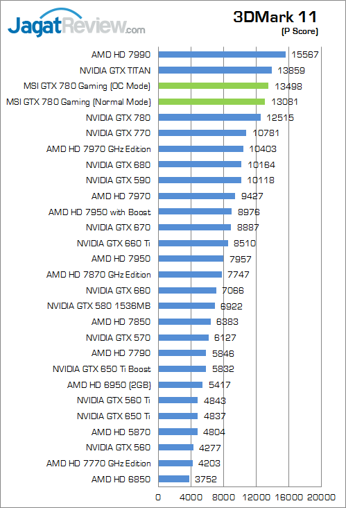 Pada benchmark sintesis DirectX 11 ini, MSI GeForce GTX 780 Twin Frozr Gaming OC mampu mendapatkan skor 684 poin lebih tinggi pada Gaming Mode dan 1185 poin lebih tinggi atau 5.5% lebih kencang pada Gaming Mode dan 9.6% lebih kencang pada OC Mode dibandingkan dengan GeForce GTX 780 reference.