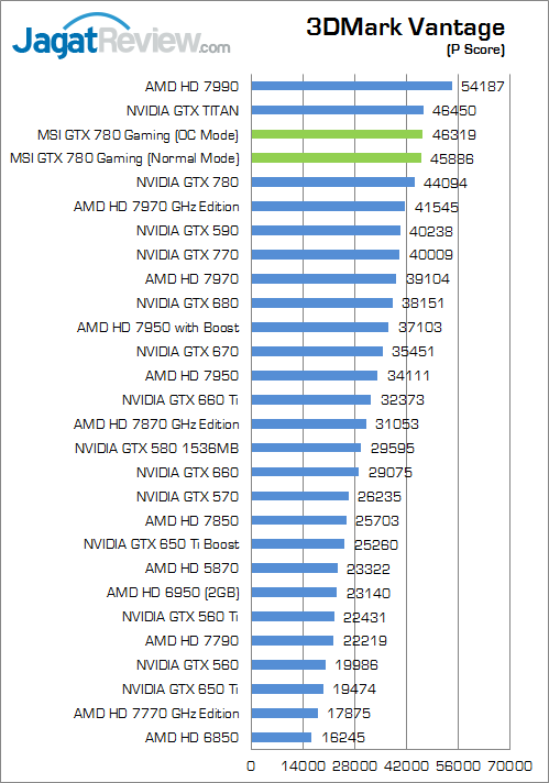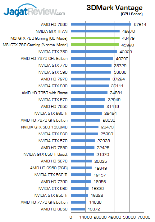 Pada benchmark sintetis berbasis DirectX 10 ini MSI GeForce GTX 780 Twin Frozr Gaming OC unggul 1992 poin pada Gaming mode dan unggul 2551 poin pada OC Mode atau lebih kencang 4.5% pada Gaming Mode dan 5.8% dibandingkan GeForce GTX 780 reference.