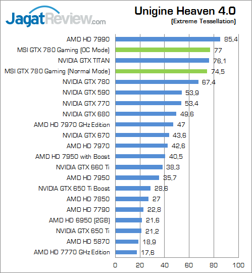 Pada Unigine Heaven 2.1, performa MSI GeForce GTX 780 Twin Frozr Gaming OC unggul sekitar 9.1% pada Gaming Mode dan 11.1% pada OC Mode di atas GeForce GTX 780 reference, sedangkan pada versi 4.0 unggul sekitar 10.5% pada Gaming Mode dan 14.2% pada OC Mode.