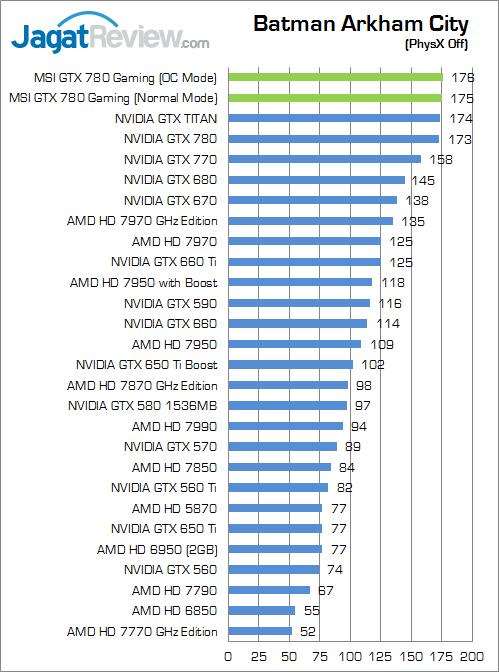 Pada game superhero berbasis Unreal Engine 3.0 ini, MSI GeForce GTX 780 Twin Frozr Gaming OC unggul sekitar 1.2% pada Gaming Mode dan 1.7% pada OC Mode di atas GeForce GTX 780 reference pada saat pengujian tanpa feature PhysX. Sedangkan saat menggunakan feature PhysX pada setting High, MSI GeForce GTX 780 Twin Frozr Gaming OC unggul sekitar 2.4% baik pada Gaming Mode maupun OC Mode.