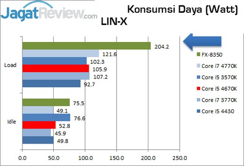 Dalam kondisi idle, Core i5 4670K terlihat lebih boros 3 watt dari prosesor generasi terdahulu. Tetapi pada saat kami mencoba memberikan load pada prosesor ini menggunakan aplikasi LIN-X. daya yang dimakan hanya sebesar 105.9 watt, lebih hemat 1.3 watt lebih hemat dari 3570K.