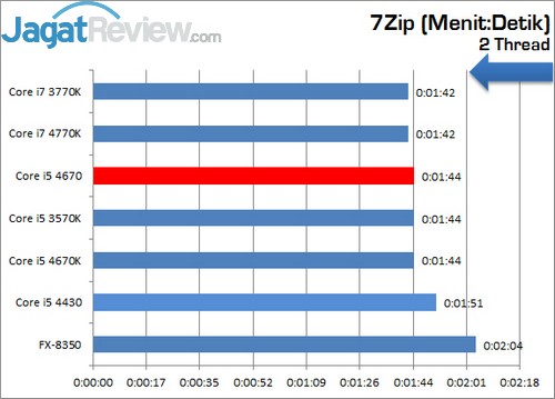 Pada pengujian menggunakan dua thread kami mendapatkan tiga buah prosesor dengan hasil yang sama persis. Prosesor tersebut adalah kedua Core i5 4670, baik seri K atau pun non K dan Core i5 3570K. Terlihat bahwa dengan jumlah core dan clock yang identik, pada aplikasi yang hanya memanfaatkan dua thread performa yang didapatkan akan sama. Perbedaan arsitektur tidak terlalu berarti, untuk mendapatkan performa yang lebih dibutuhkan clock yang jauh lebih tinggi.