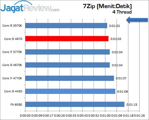 Hasil pengujian pada empat thread seakan membenarkan hasil yang kami dapatkan pada pengujian sebelumnya. Pada aplikasi multi threading terlihat prosesor ini memiliki kinerja yang berbeda tipis dengan seri K nya.
