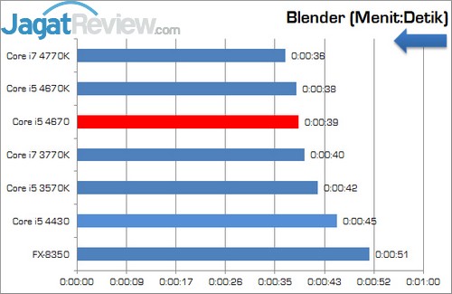 Performa prosesor ini mampu bersaing dengan saudara seri K nya. Pada benchmark aplikasi 3D diatas, Core i5 4670 hanya tertinggal satu detik atau kurang lebih 3% dari Core i54670K. Dibelakang Haswell non K ini mengekor kedua prosesor Ivy Bridge yang kami jadikan pembanding.