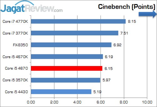 Jarak antara Core i5 4670 dan 4670k sedikit melebar pada pengujian multi thread. Walau dengan perbedaan 0.04 point pada aplikasi Cinebench ini, tetapi jika dipersentase jarak tersebut masih dibawah 1%. Sebuah jarak yang insignifigan jika kita bicar performa.