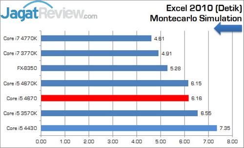 Anda tentu tidak asing dengan aplikasi spreadsheet buatan Microsoft ini. Kami menguji kinerja prosesor dalam menjalankan “Monte Carlo Simulation Table” di aplikasi ini. Hasil pengujian disajikan dalam satuan waktu. Semakin sedikit waktu yang dibutuhkan, semakin baik.