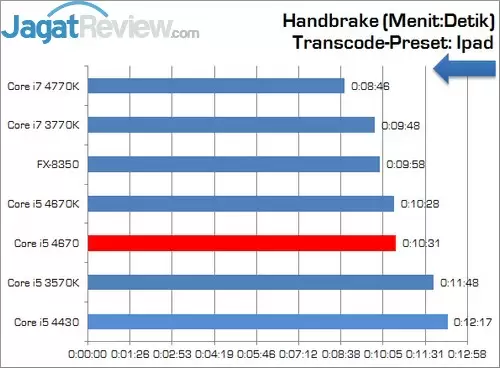 Pengujian ini seakan menvalidasi hasil pengujian kami sebelumnya. Kembali kami menemukan bahwa pada program transcode yang satu ini, penggunaan Core i5 4670 dengan 4670K akan menghasilkan performa yang sama.