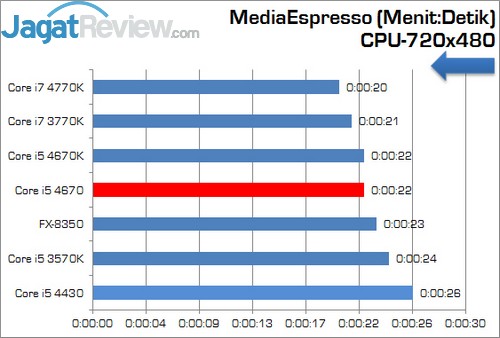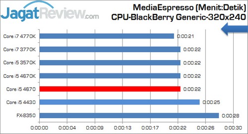 MediaEspresso 6.0 merupakan versi terbaru dari aplikasi transcoding video. Aplikasi ini mampu mengubah sebuah format video ke format video lainnya, seperti video format Blackberry, Apple iPhone, dan lain-lain. Salah satu kelebihan aplikasi ini adalah dukungan terhadap feature AMD (ATI) Stream, NVIDIA CUDA, dan di versi terbaru aplikasi ini mendukung Intel Quick Sync. Hasil pengujian disajikan dalam satuan waktu. Semakin sedikit waktu yang dibutuhkan, semakin baik.