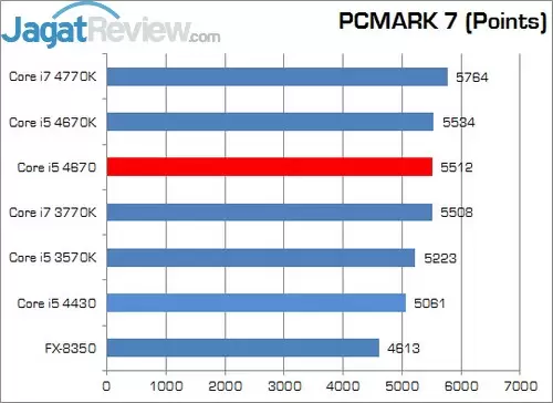 Pengujian menggunakan benchmark ini kembali menempatkan Core i5 4670 pada posisi ke 3 dengan 5512 points. Dia tertinggal 22 poin dibelakang Core i5 4670K. Secara point memang terlihat margin perbedaan antara keduanya terlihat besar, tetapi dalam kenyataannya keduanya kembali dipisahkan dengan jarak kurang dari 1%.