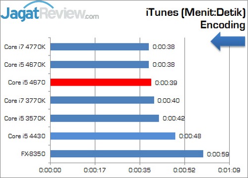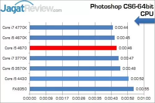 Sekali lagi terbukti bahwa performa kedua prosesor ini hampir identik. Terlihat perbedaan antara Core i5 4670 dengan 4670K hanya sebesar satu detik. Hasil ini mengkonformasi hasil yang didapatkan pada pengujian single thread lainny bahwa performa kedua prosesor tersebut sama persis.