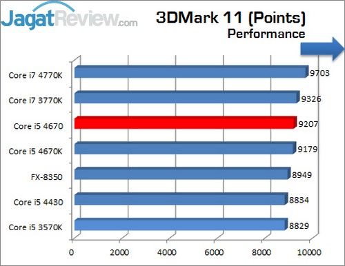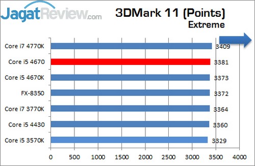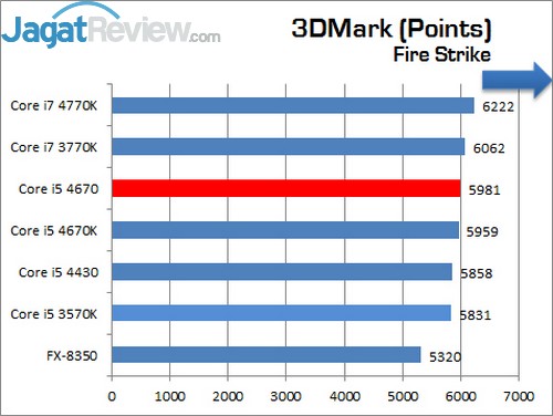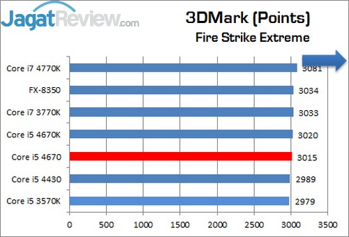 Pada pengujian ini Core i5 4670 mampu unggul atas 4670K dengan perbedaan 22 3DMark points. Perbedaan kurang dari 1% ini kembali membuktikan bahwa performa keduanya adalah sama.