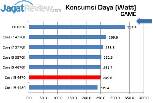 Pengujian daya pada saat bermain game pun mencatatkan prosesor ini sebagai yang paling hemat daya kedua pada pengujian ini. Dengan menggunakan sebuah graphic card GTX 680, daya yang dikonsumsi oleh Core i5 4670 hanya sebesar 249.6 Watt. Lebih boros 4% dari 4430 dan lebih hemat kurang dari 1% dibandingkan 4670K.