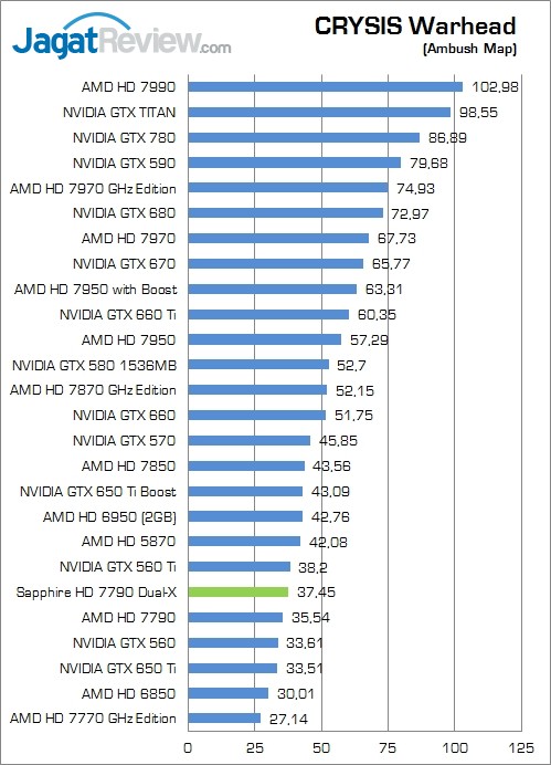 Game FPS besutan studio Crytek yang sudah cukup lawas ini tetap membutuhkan kemampuan graphics card yang besar, terlihat bahwa graphics card kelas menengah rata – rata hanya mampu menjalankan game ini sekitar 30 FPS ini memperlihatkan Sapphire HD 7790 Dual-X unggul sekitar 5.4% di atas HD 7790 reference.