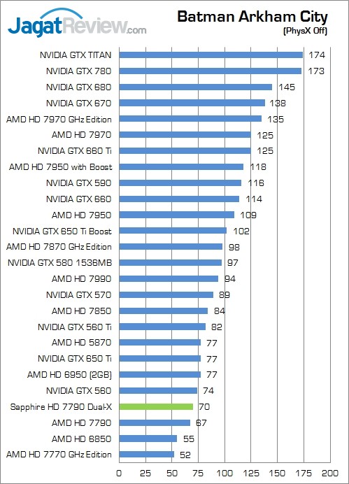 Pada game superhero berbasis Unreal Engine 3.0 ini, Sapphire HD 7790 Dual-X unggul sekitar 4.5% di atas HD 7790 reference.