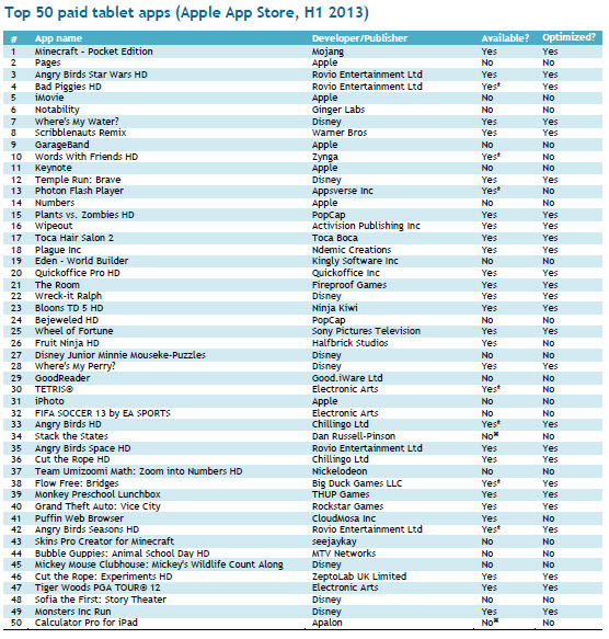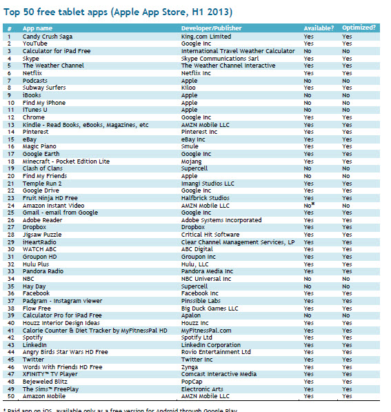 Data Canalys menunjukan, dari Top 50 aplikasi iPad baik berbayar maupun gratis di Apple App Store, 30 persennya tidak hadir di Google Play. Ironinya, 18 persen aplikasi iPad yang tersedia itu tidak dapat optimal ketika dijalankan di tablet Android.