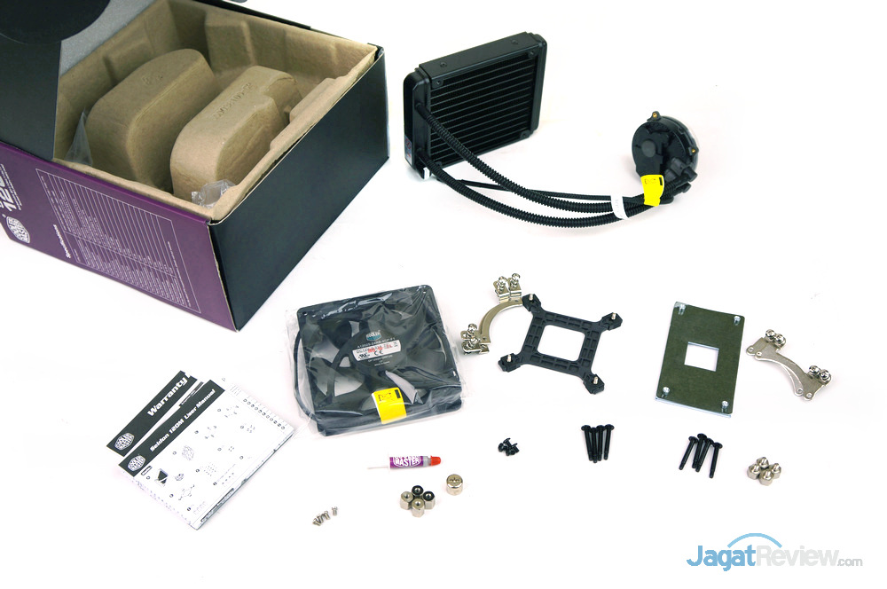 Pendingin dengan harga kurang lebih 70 USD ini menyandang radiator 120mm dan sebuah kipas 120mm pula. Berbeda dengan Corsair dan Enermax yang menggunakan pre-applied thermal paste pada base waterblocknya, Cooler Master menyediakan sebuah tube kecil berisi thermal paste yang bisa digunakan untuk 2-3 kali pemasangan.