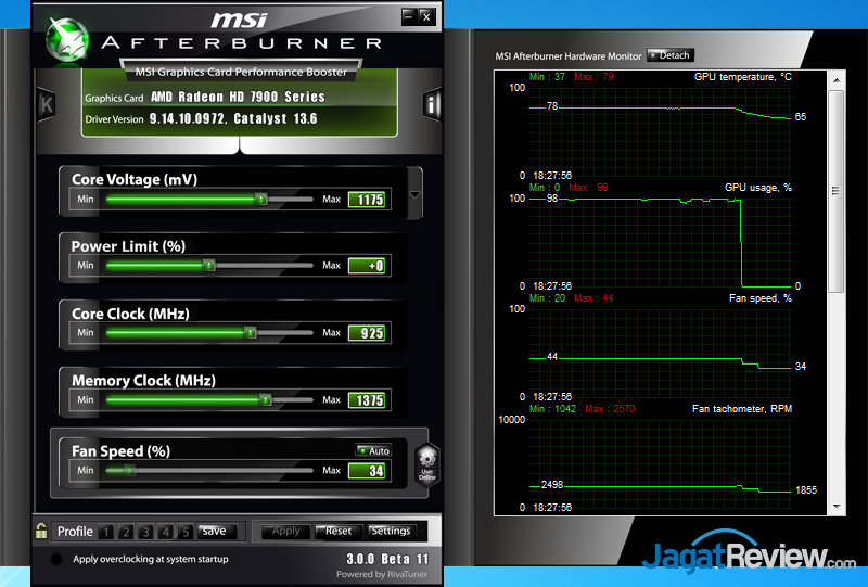 Pada pengujian kami dengan menggunakan Radeon HD 7970 reference, pada kondisi “Auto”, kecepatan maksimal kipas hanya mencapai 44% dengan temperatur graphics card mencapai 79 °C. Sedangkan saat kami naikkan kecepatan kipas menjadi 50%, temperatur graphics card turun menjadi 68 °C. Tidak berhenti sampai disitu saja, dengan menaikkan kembali ke angka 75% dan 100%, kami mendapatkan temperatur graphics card menjadi 61 °C dan 58 °C. Tips ini tidak hanya berlaku untuk graphics card AMD tetapi juga untuk graphics card dari NVIDIA.