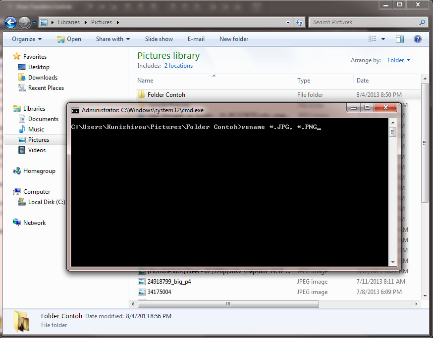 Untuk mengubah tipe file, Anda tinggal menuliskan perintah “ren *.(tipe file awal) *.(tipe file yang hendak diubah)”. Seperti misalnya, Anda hendak mengubah file gambar tipe .JPG menjadi tipe .PNG, maka yang perlu Anda ketik adalah “ren *.JPG *.PNG”.